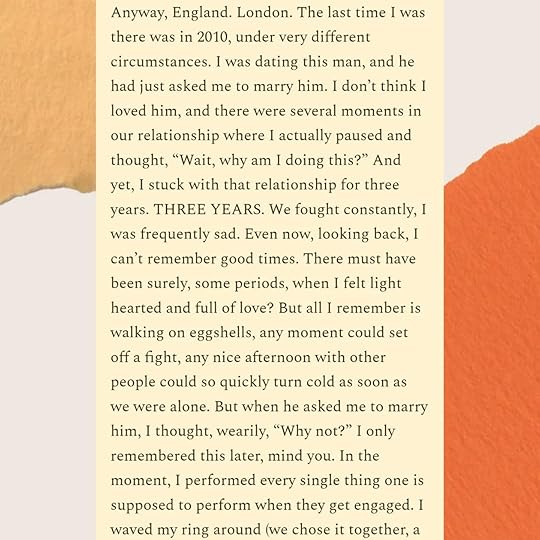 Anyway, England. London. The last time I was there was in 2010, under very different circumstances. I was dating this man, and he had just asked me to marry him. I don’t think I loved him, and there were several moments in our relationship where I actually paused and thought, “Wait, why am I doing this?” And yet, I stuck with that relationship for three years. THREE YEARS. We fought constantly, I was frequently sad. Even now, looking back, I can’t remember good times. There must have been surely, some periods, when I felt light hearted and full of love? But all I remember is walking on eggshells, any moment could set off a fight, any nice afternoon with other people could so quickly turn cold as soon as we were alone. But when he asked me to marry him, I thought, wearily, “Why not?” I only remembered this later, mind you. In the moment, I performed every single thing one is supposed to perform when they get engaged. I waved my ring around (we chose it together, a thin ring with tiny diamonds in a circle, so pretty. But I remember the salesman who sold it to us saying, “There’s a good return policy.” And at the time I thought that was so crass, how can you say, “There’s a good return policy” to a couple starting on a new journey? But maybe he saw something in our faces, or his at least, because by now I had bought entirely into the fiction that this was all extremely delightful for me) I had a small engagement party, I told everyone, my mum started thinking about venues, you know, the whole shebang.