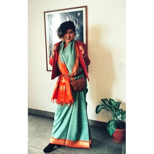 For yesterday's #pravi wedding ceremony, I decided to wear a sari which meant I had to layer and accessorise so I could still look reasonably stylish while also being as warm as toast. So, in case you need similar tips: underneath, I'm wearing fleece tights and a petticoat, on top there's a black body suit, the orange blouse and a deep necked black pullover, which meant you could sort of see the blouse through the pallu. Since I wanted to wear my red leather jacket on top, I wore my pallu like this and added a fanny pack to double as a belt. This is an ancient kanjivaram raided from my grandmother's cupboard, about 70 years old. When the silks first became popular outside Tamil Nadu, they only did limited colours so my great aunts all have some version of this too. Despite her great age, the sari still has plenty of life in her yet and did indeed keep me as warm as toast while also attracting the compliments which were her due. (if old cars can be women, why not old clothes with plenty of history in them too?) #whatiworetoday