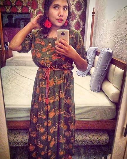 I don't know why the only photo where this dress looks best is also one in which I'm closing my eyes, but there's only so many times I can get K to take a photo again sooo yes. I have a lot of new clothes! Prepare yourself! This from Sarojini as well, they had a lot of the same cut with different patterns and I bought polka dots because obvs. I also bought a RED dress with WHITE polka dots but you can't have too many dots right? This is from last night, today I'm in a car on my way to Jindal Global University's lit fest and listening to the Babysitter's Club Club podcast on the loooooong drive there. #whatiworetoday
