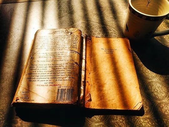 You probably can't read the title because this copy of one of my all time favorite books in the whole WORLD is so beat up, held together by ancient pieces of sticky tape. But yes, eagle eyed reader, it IS The Secret Diary of Adrian Mole Age 13 and 3/4ths. Plus two other volumes of his life. I forget when I got this. Definitely a birthday present, definitely early teens. I've read it a zillion times since, plus his later life which I didn't find half so funny. I think all geeky self important teens WERE Adrian Mole, so I couldn't laugh at him the first time round but on rereading now I also find it a little sad. Isn't that odd? #bookstagram #mrmbookclub #nowreading