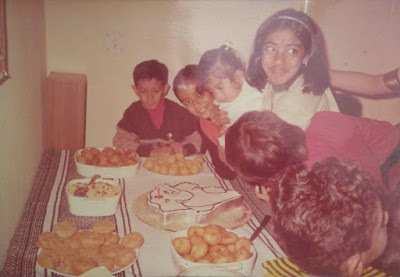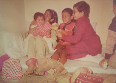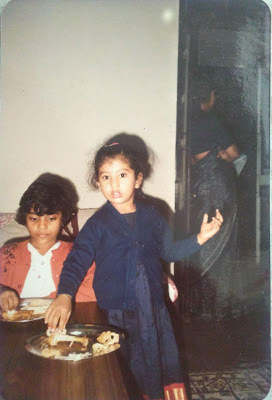 I call it my "leave me alone, I'm eating" face. I think my grandmother was visiting, which is probably why I was dressed so fancy. In fact, I think I remember this little lehenga, she brought it for me with a matching one for my Cabbage Patch doll. I loved that doll, she was brown skinned and had a dimple and an adoption certificate (I think her name was Joanne?) but I don't think I ever made up stories with her as much as I did with my other toys. Joanne was great, but she didn't leave very much to the imagination, she already had a name and a back story, unlike my beaten up teddy bear: Red Rose (and his little brother, Yellow Rose.)Red Rose was also a birthday present, from this same Appu birthday as pictured above. The girl next to me seems like she was very clingy, she's in all the photos. She's probably married with kids now, and we wouldn't recognise each other if we passed on the street. "Gosh," my own baby face is saying, "Why can't this chick leave me alone so I can go back to playing with my NEW TOYS." The perils of popularity. (ETA: My mother tells me actually this girl and I shared a mutual love for each other and any time she wanted to find me, she'd go to this girl's house and ask, because I was usually there, but I think the photo speaks for itself. There's a time and place for everything!)