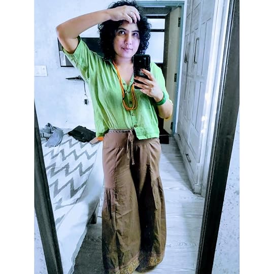 Another piece from this time's tailor made clothes. This time this green checked shirt, designed based on a photo I found online, it's cropped and you can't really see but the collar is made out of the gold border. Swipe to see how perfectly thin and cool it is, I really love this fabric, wish I'd bought more! Paired here with old Anokhi sharara pants which I bought, seldom wore and am now discovering a new love for. Isn't it nice when that happens? Also I desperately need to get a haircut, here I am moving it out of my face so I'm not peering at you through it like a sheepdog. #whatiworetoday