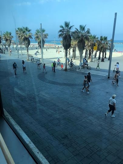To start with, there’s the Mediterranean Sea, with its long sandy beaches, kept relatively clean by the municipality, with designated areas for people to play games (ah, the dreaded ‘matkot’ with their constant noisy batting to and fro of a ball against wooden bats), another area for dogs off the leash (but they must be well-behaved) with a special shower for dogs, and the wonderful kilometer after kilometer of the promenade. Anyone venturing out early in the morning (say, 6 a.m., even on a Saturday, supposedly the day of rest), as I did, encounters throngs of other like-minded people, whether singly, in pairs, small groups or even large groups, walking, jogging or running along it. Some people even manage to conduct a conversation as they jog, which seems almost superhuman to me. There are couples or groups wear matching outfits bearing slogans or designs aimed at attracting attention, but most people wear modest sports gear, and of course the ubiquitous sports shoes. And of course, there are also people walking their dogs, though always on a leash. I didn’t notice any dog-poop on the promenade, so presumably their owners were dutiful about cleaning up after their pets.