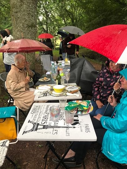 To make matters worse, the traditional ‘Polyglot Picnic,’ organised by a friend in order to bring French and English-speaking residents of the area together, was forced to come to a sudden end when a (predicted) downpour arrived. Since most of the participants were originally from the U.K. (I won’t say England, as some were from Wales and might take offence) and not unused to this kind of weather, we were wearing warm clothes and stout shoes, and were all equipped with umbrellas. As the picture shows, the brollies came out when the rain began. We tried to stay at our posts, but the weather soon became too much, even for us hardy souls, and a hasty — and slightly muddy — retreat was beaten. Still, the company was great, and we enjoyed meeting up with our friends. Those of us who were visiting from abroad shared tales of the intrepid endeavours we had to endure in order to get to our destination.