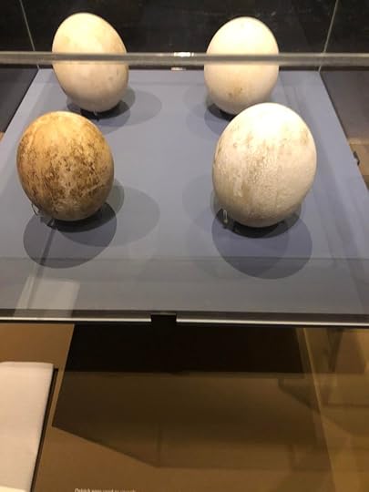 A well-lit display case contains four enormous ostrich eggs, found in the Land of Israel and dating from between 3500 and 3550 BCE. Due to their size and thick waterproof shell they were used as luxury vessels in ancient Near Eastern cultures. The oldest egg on display is around 5,500 years old.