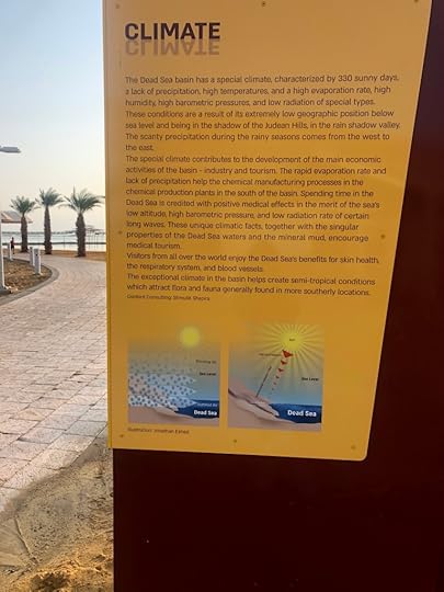 A third notice-board is headed simply ‘Climate,’ and this one decribes the features which characterise the Dead Sea region (high temperature, high evaporation rate, high barometric pressure and low radiation) due to the fact that it is situated below sea level. The notice also states that the region is characterized by high humidity, but to the best of my knowledge the opposite is the case. Be that as it may, the natural resources of the Dead Sea are used in the chemical and mineral industries, as well as providing medical benefits.