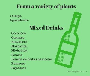 The first alcoholic beverages in Mexico were created from the agave plant which is the source of tequila, mezcal, raicilla, bacanora, comiteco, curado, Licor de henequén, and pulque.