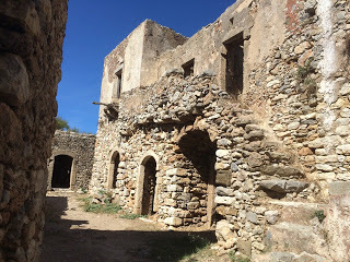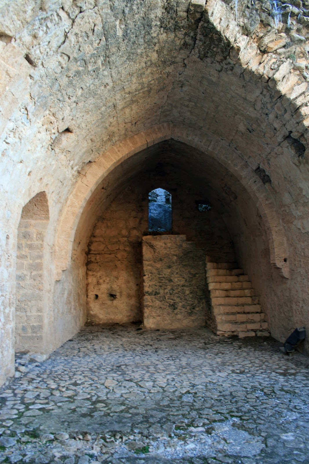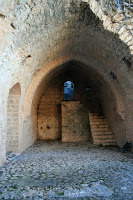 Most houses in the crusader states appear to have had at least one, and in urban areas -- particularly in the 13th century -- as many as three upper floors. The upper floors were often reached by means of an external stairway over a arch (see photo below), or by means of internal wooden stairs or even ladders through trap doors. In larger, rural structures, stairs could also be built into the thickness of the walls. The house below, located on Kythera, is much younger (17th century Venetian), but it has many of the features of crusader urban architecture.