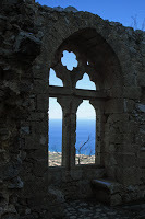 Despite the prevalence of courtyards, Frankish houses were not inward-looking. Unlike their Arab contemporaries, the houses of the rich had beautiful balconies and logias that looked out over the streets from the upper stories. The roof of the logia in urban areas might be supported either by an arcade or by pillars. Some of these pillars were reclaimed Roman pillars, employed in a new function, but the Franks were skilled at producing pillars themselves and the capitals of these were famous -- even among their enemies -- for the lifelike quality of their decoration. In rural settings the logia could be even more dramatic as in the example below from St. Hilarion on Cyprus.
