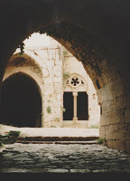 Windows could be either arched or square, with the Romanesque forms of “double-” or “triple-light” windows as common in the Holy Land as in the countries of the crusaders’ origin. Below is a lovely example of a medieval portal in Jerusalem, and left and right are two examples of windows from St. Hilarion and Krak de Chevaliers respectively.