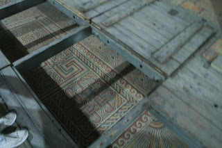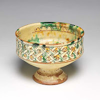 As the description at the start of this essay indicated, interior décor could include poly-chrome marble, but mosaics and glazed tiles may also have been used. Certainly, a wide variety of crusader glazed pottery has been found, using cream colors, yellows, greens and blues. The pottery gives us some indication of what colors and motifs could have been used on floor and wall tiles, although the evidence is lacking. To the right is an example of crusader pottery.