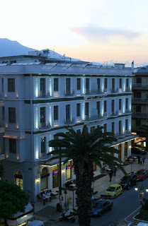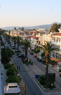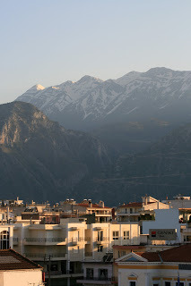 Returning from Kythera, my husband and I spent a night in Sparta (“Sparti,” as the modern town is designated on most maps and signs nowadays, is Ionian; I prefer to use Doric, which shows up now and again on local signs). The modern city, full of students, traffic clogging the main street and disco music filling the night air, is not always the best place to evoke ancient Sparta, but it has charm of its own. The palms of the main avenue remind one of the more trendy cities on the Riviera, but the backdrop of snowy Taygetos is more beautiful. There are good restaurants, good hotels, a pretty square with a monument to the Three Hundred, and a charming little museum with some excellent pieces of Lacedaemonian sculpture. The ancient acropolis is far enough away from the heart of the modern town to allow a stroll in contemplative silence, and I am always pleased to see the Leonidas standing guard in front of the soccer stadium. In short, I always enjoy a stop in Sparta on our way to or from Kythera.