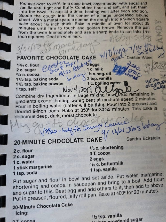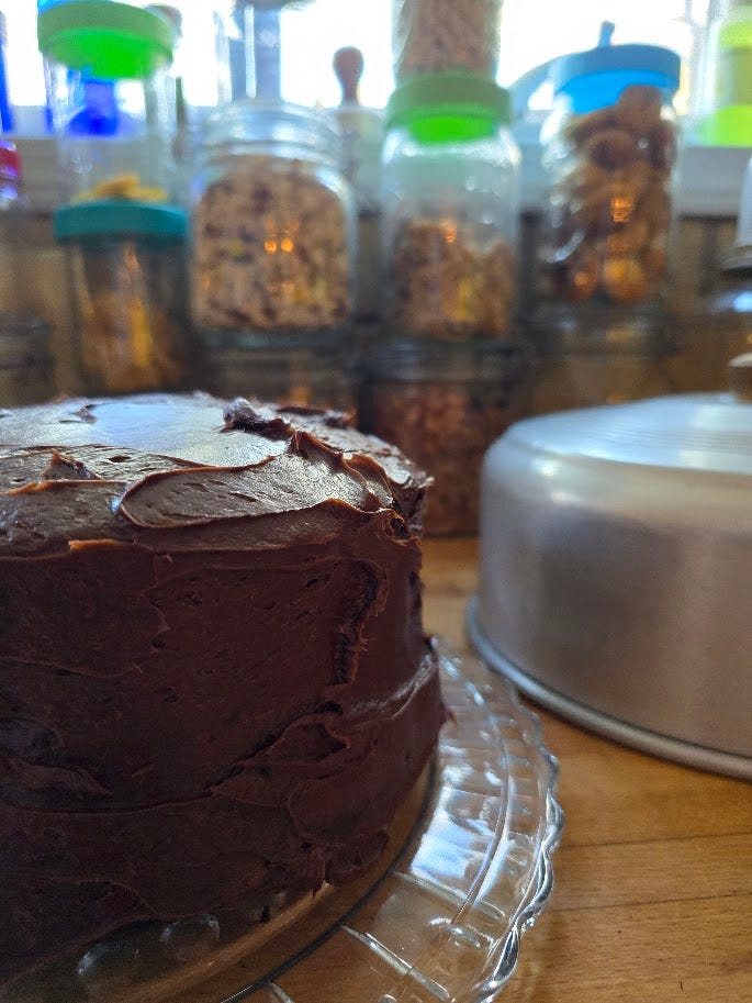 That last would have qualified as my favorite of the month, except that… we’ve had CAKE! In the Chat we’ve had stories and recipes about cake: the Spicy Ginger Applesauce Cake (with cream cheese icing!) that was my downfall (in pounds gained, and no regrets) two weeks ago; Jennifer’s mom’s Oatmeal Cake (complete with handwritten recipe cards); full treatises (treati?) on German Chocolate Cake (recipes to come) and how D likes the cake alone but I must have the Coconut Butter Pecan Frosting.