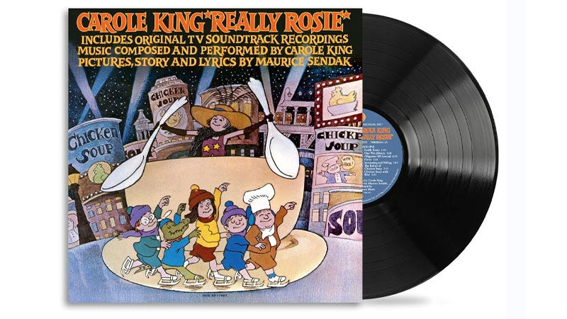 I can still hear Carole King singing “Alligators All Around” from the album “Really Rosie,” still see Maurice Sendak’s art when I close my eyes, still see my Ops-Guru (who was an 8-year-old then) oh-so-carefully placing the needle onto the record on his Fisher Price record player, to sing along with “Chicken Soup With Rice” one more time. There’s a food for ya. (All song links are at YouTube.)