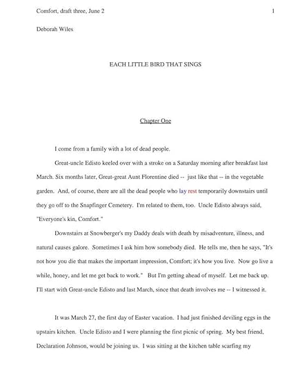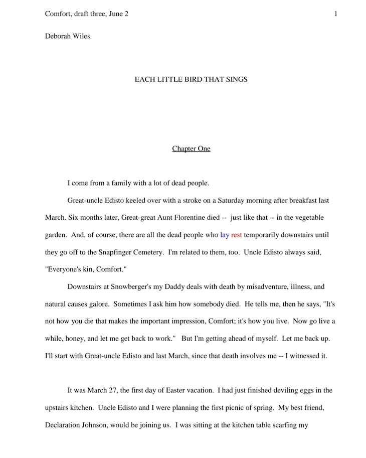 And of course I did write about this mess. I used that line from Kay as the first line of what would become Each Little Bird That Sings. I named my main character Comfort, because I needed so much comfort as I wrote my heart out, and I needed perspective, so I created two older characters who I dispatched in the first chapters, but who wove some much-needed humor through a story that I thought would be all about death, but it turns out was all about life. “Open your arms to life!” Uncle Edisto tells Comfort. “Let it strut into your heart in all its messy glory!”