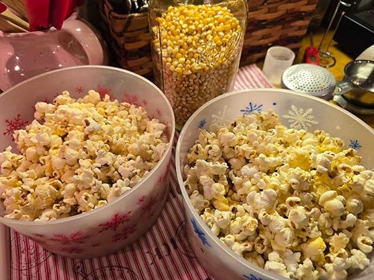 I don’t know when I started the ritual of making popcorn when I’m writing, but it always makes me happy, for many reasons, the highest of which is, it means I *am* writing, and usually it means the writing is going well. I don’t mess around, either. I use my deepest, heaviest pot, and always make two big bowls. One pot full of popped corn will fill them both.