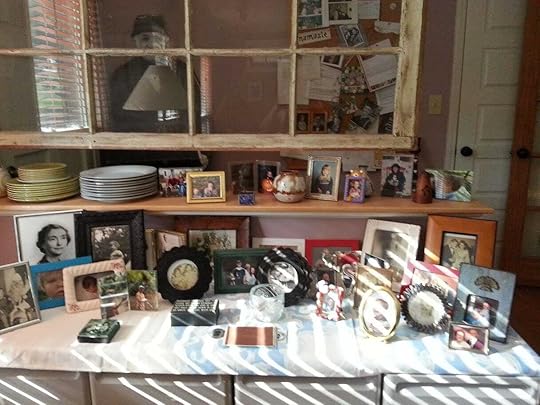 Here is the altar in my writing studio. It is the living/dining room (Ruby would call it “the front room”) of my house. I call the studio “my office” most of the time, because my dad always used that term for the bedroom he turned into the space just-for-him, where he lined one wall with shelves and filled it with Time-Life books, encyclopedias and their yearbooks that came in the mail every January, Scientific Americans, Book of the Month Club books, Reader’s Digest condensed books, and old books that held such mystery for me, such as My Search Through the Heavens, a book that felt out of place with the others, but that moved from house to house with us, from office to office, so it must have meant something to my dad.