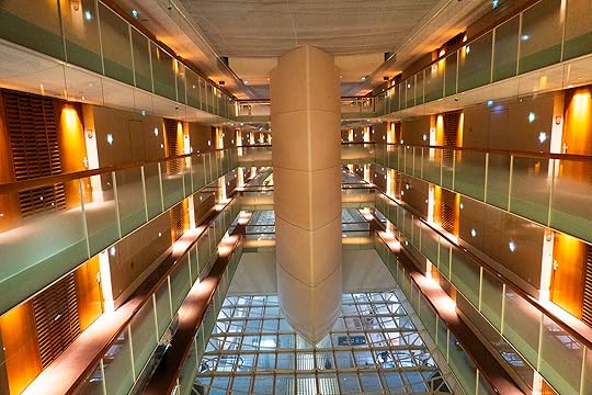 The design of the hotel is shaped like a ship with a prow, or (more aptly) an airplane. The internal atrium has a glass floor, and I was surprised to note that you could see down with a view through a transparent ceiling (the floor of part of the atrium) into the train platforms for the RER into Paris.