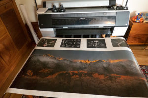 I just made this large panoramic print of the High Sierra Crest on commission via Weston Gallery on Moab Paper Juniper Baryta Rag! The print is shown here curing, with our printer in the background.