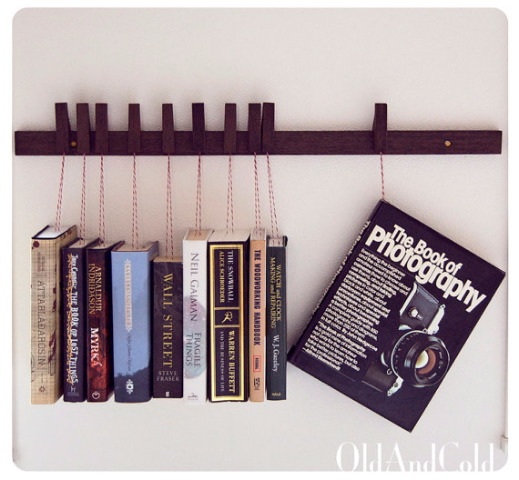A bookshelf that looks like the books are hanging by a string. They're not. They're actually resting on a small wooden plate. From NYDailyNews .