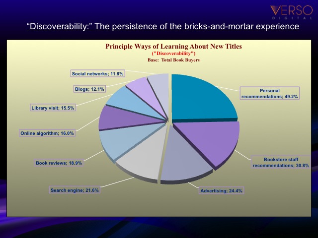 Readers find out about books mostly through personal recommendations (49.2%), bookstore staff recommendations (30.8%), advertising (24.4%), search engine searches (21.6%) and book reviews (18.9%). Much less important are online algorithms (16%), blogs (12.1%) and social networks (11.8%). These results "reaffirm the power and necessity of bricks-and-mortar stores and traditional marketing efforts," McKeown commented.