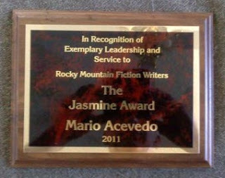 During the awards banquet, I was reading the program and wondering when and if I would ever be worthy of a Jasmine Award. Bestselling author Jasmine Creswell is one the the founders of RMFW and graciously set up the award to honor a member for Exemplary Leadership and Service to RMFW. So I was stunned to learn I was this year's recipient. May I remain worthy.