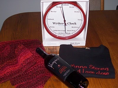 A hand-knit scarf and cap from LaRay and Nikki Gillison, a bottle of Vampire wine from Kathy Self, the Writer's Click from Linda Rohrbough, and a tee shirt from an anonymous reader. Thank you's are on the way!