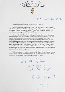 And this nice piece that I think I got from Shelf Awareness or UK Guardian, but for some reason I didn't not the source. My apologies. In it, she thanks a fan who wrote how much the HP books meant to her. Worth searching out a magnifying glass.... oops-- found the link
