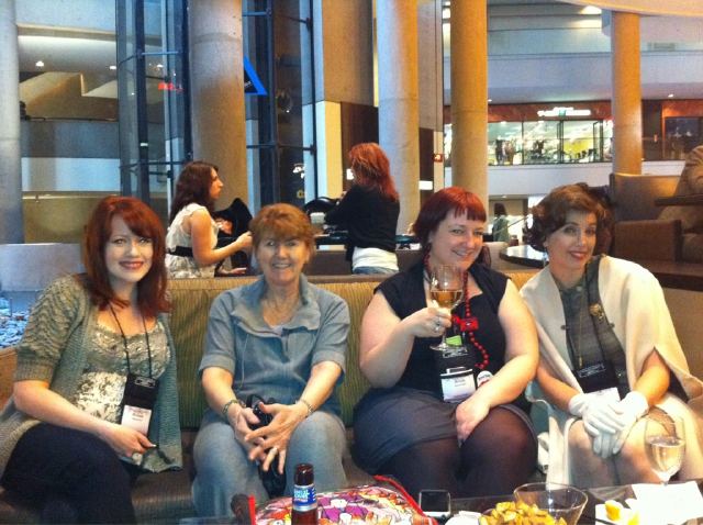 My spy sent this photo of Jeanne sandwiched between Richelle Mead and Nicole Peeler at RT2011. Jeanne tries to look sober though you should notice the open bottle in front of her. Busted!