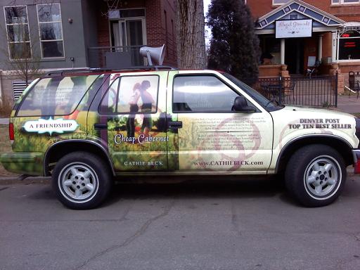 An SUV done up as a rolling press release. Not only was the truck covered in snazzy advertising film but also carried a loud speaker for God knows what audio promotion?