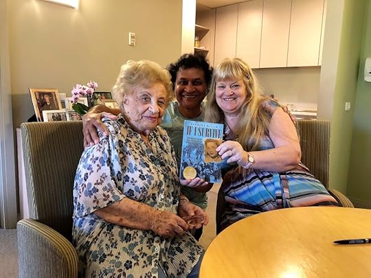 Left – Norman and Barbara with William Cooper Gentle Warriorbook and right – Lena Goldstein on her 100th birthday as Norman and Barbara present her with Barbara’s book on Lena’s life story – If I Survive.