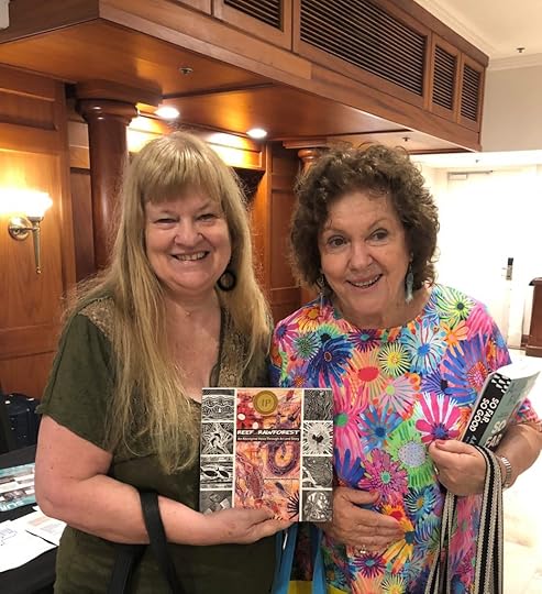 Below Left Norman Miller, David Hudson MC, and Barbara at the Writers dinner, and Below Right, Barbara giving Norman’s book Reef and Rainforest: An Aboriginal Voice Through Art and Story to former Lord Mayor of Brisbane, Sallyanne Atkinson AO who hosted a session in conversation with Torres Strait Islander actor and author Aaron Fa’Aoso.