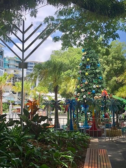 The photo on the left is of the Hanukkah menorah and Christmas tree standing side by side on the Cairns Esplanade where I live. On the right, I’m checking out a bookshop.