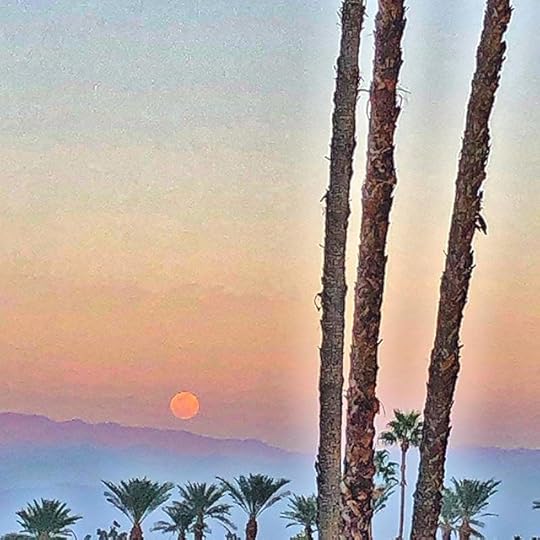 Snow Moon rising during a smoky desert sunset. #coachellavalley #ranchomirage #ranchomiragelife #desertsunset #sunset #desert #desertlife #chaletpalms #chaletpalmsranchomirage #patricklivanoslester #rhumblinepress #palmtrees #palms