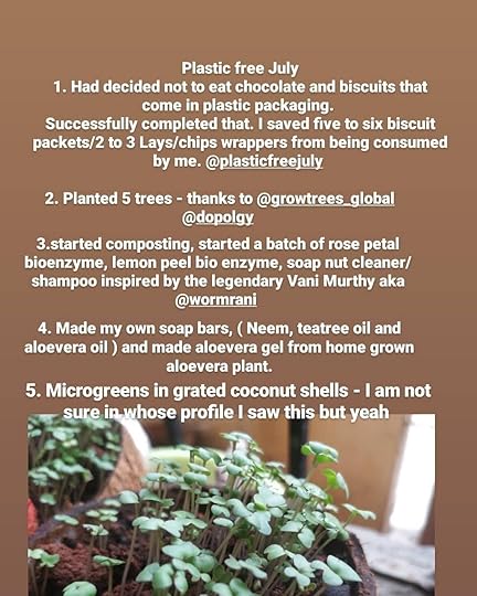 Lemon and rose bio-enzyme with left over citrus peels and flowers after puja are used to make a plastic free/detergent free cleaning liquids used to clean the floor, utensils and even washrooms. Made one batch of lemon and rose bio enzyme.Made a natural shampoo with soap nuts. It makes the hair smell wonderful and removes the grime and keeps the roots strong.Did some carbon offseting with planting 5 trees with Grow trees. https://www.grow-trees.com ( you can do it too its just 85 rupees per tree)Collected around 13 kgs of Ewaste and gave it away to Saahas . They collect e-waste and make sure it is recycled in a clean and sustainable manner.Started to grow micro-greens in the natural pots of grated coconuts.