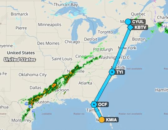 This map shows today’s early frontal activity and I’ve sketched in a rough line of how traffic generally flows north from Miami to Montreal. The standard routes arrive into Miami across the Gulf of Mexico on the west and the Atlantic on the east, Departing flights northbound are channeled along central Florida before dispersing towards their destinations.