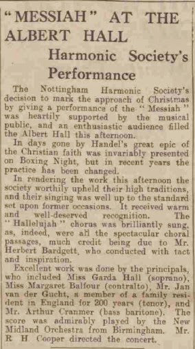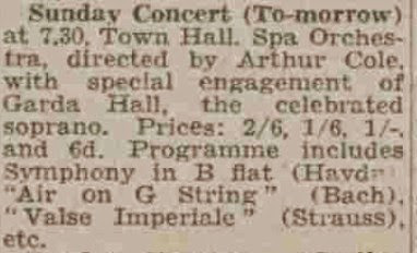 On 15 March 1934 Garda Hall sang in Torquay with the Municipal Orchestra there and the short newspaper article announcing the date pointed out that her father had been a Torquay man. She sang an aria from Die Fledermaus at the Queen’s Hall on the last night of the Promenade concerts on 6 October 1934, conducted by Sir Henry Wood.