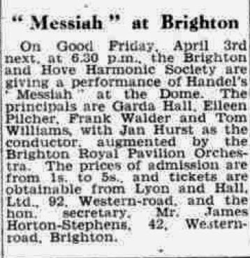 A newspaper cutting on 20 March 1930 reads as follows: The Clerkenwell Benevolent Society benefited to a considerable extent as a result of a concert at the Finsbury Town Hall on March 6. There was a generous provision of talent, among those to please a large and enthusiastic audience being Garda Hall, Doris Smerdon, Gladys Limage, Doris Godfrey, Hilda Gladney Woolf, Maidie Hebditch, Webster Booth, Ashmoor Burch, Charles Hayes, Fred Wildon and Lloyd Shakespeare, with Charles Forwood as accompanist. It is interesting that some of these names are still remembered today, while others are completely unknown.