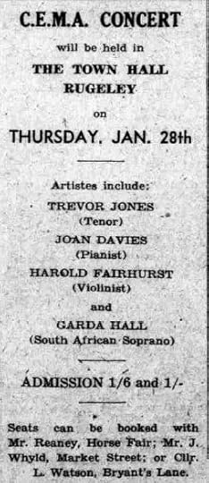 The following year Webster sang with Garda again on 16 September at a Shrewsbury Carnival Concert. Other performers were Ronald Gourley (entertainer) and the Alfredo Campoli Trio.