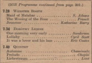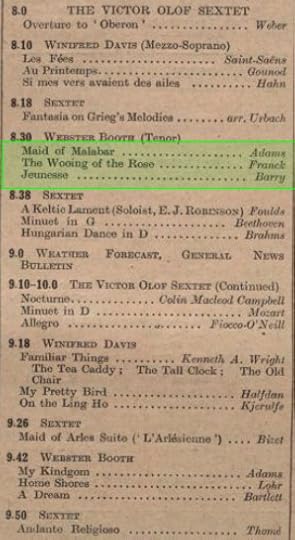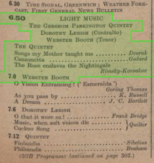 A BALLAD CONCERT – Regional Programme London, 20 October 1931 12.00 EDITH DELANEY (Soprano), GWLADYS GAUSIDE (Contralto), WEBSTER BOOTH (Tenor), EDERN JONES (Baritone), MAY JARDINE (Pianoforte)