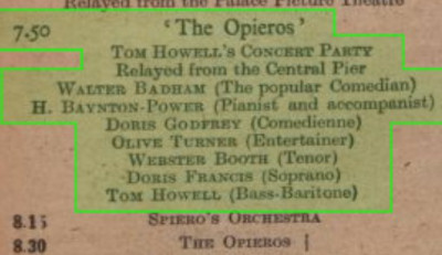 THE OPIEROS – 2ZY Manchester, 6 April 1929 19.50 TOM HOWELL’S CONCERT PARTY Relayed from the Central Pier, Blackpool