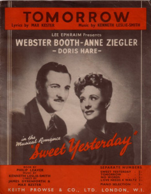 On 6 March 1930 Webster Booth was establishing himself on record, radio, as the Duke of Buckingham in the West End production of The Three Musketeers, and as a tenor soloist in oratorio, but he was still entertaining at dinners and benefit concerts, such as one at the Finsbury Town Hall for the Clerkenwell Benevolent Society, where South African soprano, Garda Hall was one of the other entertainers. Charles Forwood, who was to become the permanent accompanist of Anne Ziegler and Webster Booth when they went on the variety stage in 1940, accompanied at this concert.