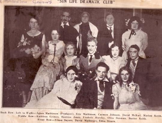 He had been offered a job in his trade, but had been told that they expected him to pass on information about the activities of the other employees. My father refused to act as a spy and turned the job down at a time when thousands were pounding the streets in the extremely cold weather, and depended on a meal at a soup-kitchen to keep body and soul together. In Toronto there were more cousins of my mothers, the Mathiesons. There is a picture of Agnes Mathieson, a formidable lady, noted as the producer of a play staged by ‘The Sunlife players’.