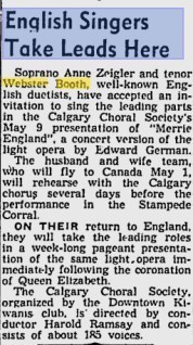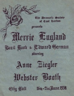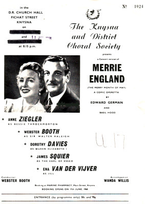 11 to 13 July 1968: MERRIE ENGLAND (Concert Version) at 8.15 pm Knysna and District Choral Society D R Church Hall, Fichat Street, Knysna Webster, Anne, Dorothy Davies, James Squier and Ena Van der Vyver, directed by Anne Ziegler, conducted by Webster Booth, Accompanist: Wanda Willis.