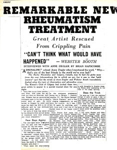 In late 1957 they were featured in an advert for Lloyd’s Adrenaline cream in South Africa. According to the advertisement, this cream had given Webster relief to excruciating sciatic pain he had suffered on their fleeting visit to Calgary to appear in Merrie England. Apparently Anne used the cream whenever she had an attack of fibrositis.
