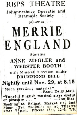 12 to 29 November 1958 MERRIE ENGLAND, Reps Theatre, Johannesburg JODS. Anne and Webster starred and produced the show, with Marian Saunders, June Bass, Nohline Mitchell, Kenneth Anderson, Len Rosen, and Dudley Cock, conducted by Drummond Bell.