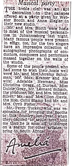 Anne and Webster at a concert in 1957, Anne had her hair cut in an ‘Italian Boy’ style. She was the talk of Johannesburg!Because of worsening tax problems they decided to emigrate to South Africa and left the UK in July of 1956, intending to settle permanently in the country, not realising that there was not really enough first-class professional work for them after the initial excitement of their arrival. Most South Africans wondered why a successful couple like the Booths had chosen to settle in the country. Most assumed that they had not been doing as well in the UK as before and that was why they had moved to South Africa. Few knew about the income tax demands.
