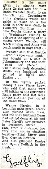 A couple of years later Anne and Webster were commissioned to produce another pantomime in the Opera House, Port Elizabeth and this time I had a part in the chorus. A vivid memory of rehearsals in the PEMADS theatre was Webster completely losing his temper with Peter, the publicity agent. Peter had designed the front page of the programme and the flyers with Webster’s name (as musical director) underneath Anne’s as producer – in smaller letters!! How he raged at Peter for that, in front of the entire cast. And Anne gave her husband her full support – as she did throughout their marriage.