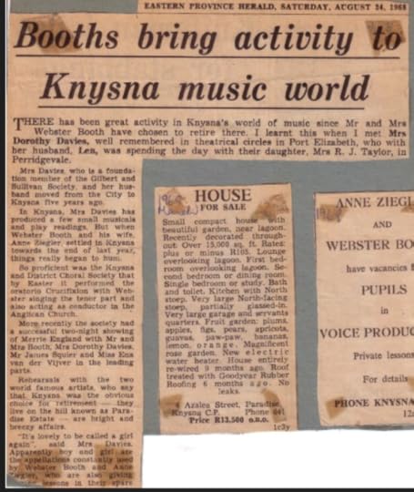Although Anne and Webster left Knysna to live in Somerset West in 1975 they kept in touch with Freda, who had by this time married widower, Len Davies, in Knysna. His first wife Dorothy had been a stalwart in the Knysna and District Choral Society. In fact, I had come across this article in the Port Elizabeth Herald when the SA Oranje docked in Port Elizabeth when I was returning to South Africa in August of 1968. Although they had not been long in Knysna at the time it looked as though they were hoping to sell their first house.