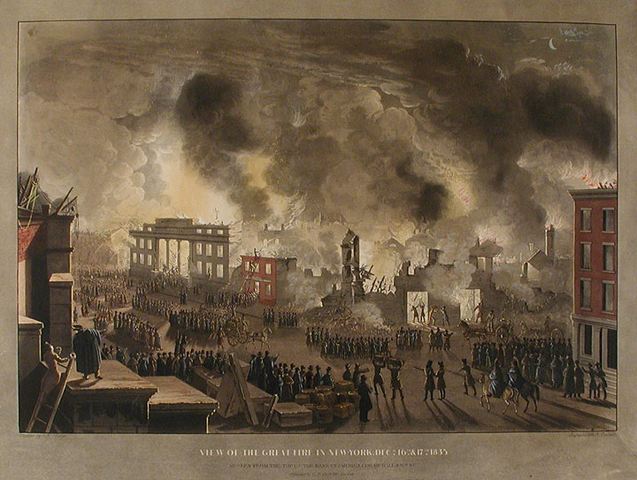 On the night of December 16, 1835, a gas line broke in a dry goods store near Hanover Square in the Financial District; the gas, ignited by a coal stove, caused the store to explode and the ensuing fire quickly fanned southward along Stone Street and northeast toward Wall Street. Not only was it the worst fire in New York’s history, it wiped away almost all of the remaining traces of the old Dutch and British colonial city.